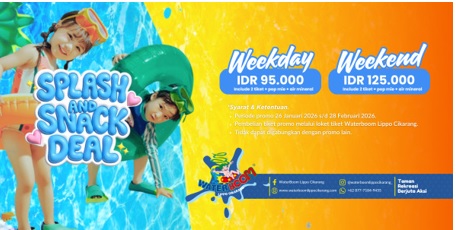 Promo Splash and Snack Deal berlaku mulai 26 Januari hingga 28 Februari 2026. Pengunjung dapat membeli tiket promo ini secara langsung di loket tiket WaterBoom Lippo Cikarang selama periode program berlangsung.