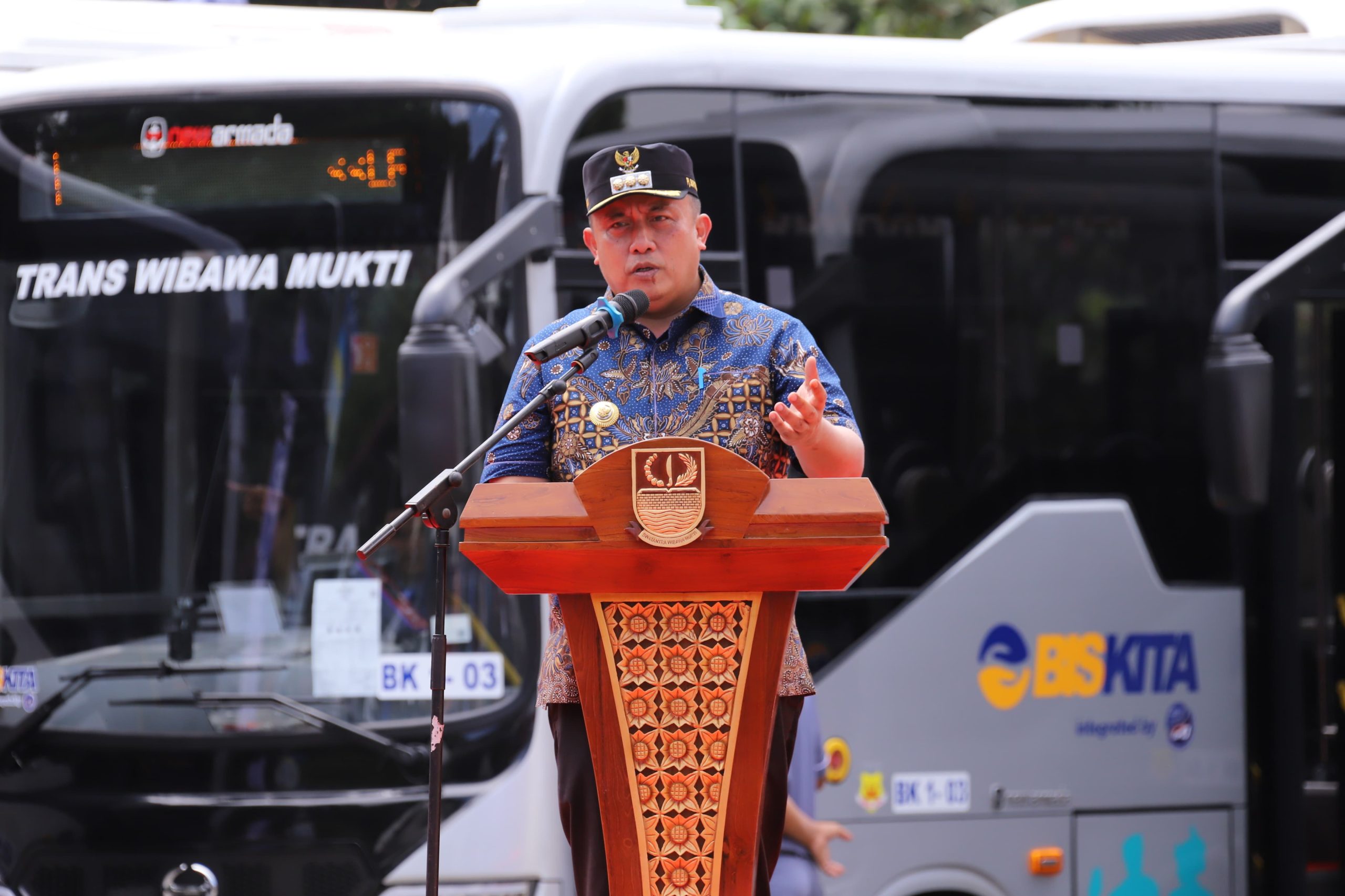 Launching Bus Trans Wibawamukti dihadiri oleh Pj Bupati Bekasi Dedy Supriyadi, Plt. Direktur Angkutan Badan Pengelola Transportasi Jabodetabek (BPTJ) Kementerian Perhubungan, Solihin Purwantara, Ketua DPRD Kabupaten Bekasi, Ade Sukron dan Kepala Dinas Perhubungan, R. Yana Suyatna.